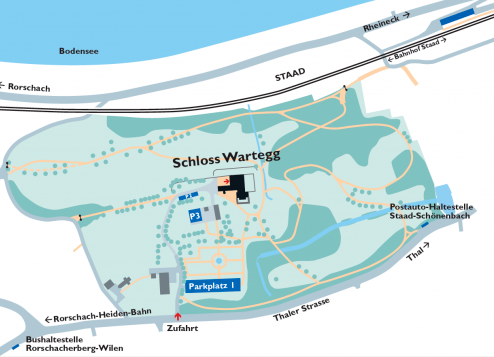 Halbstündlich ab Zürich (1 Std. 40 Min.) und stündlich ab Chur (umsteigen in St.Gallen oder St.Margrethen). Fussweg ab Bahnhof Staad (8 bis 10 Minuten). Bitte beachten Sie, dass der Weg zum Schloss stellenweise aus Kies besteht und leicht ansteigt. Die Fahrt mit dem Taxi vom Bahnhof Rorschach bis zum Schloss Wartegg dauert etwa 5 Minuten.
