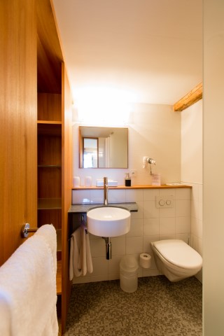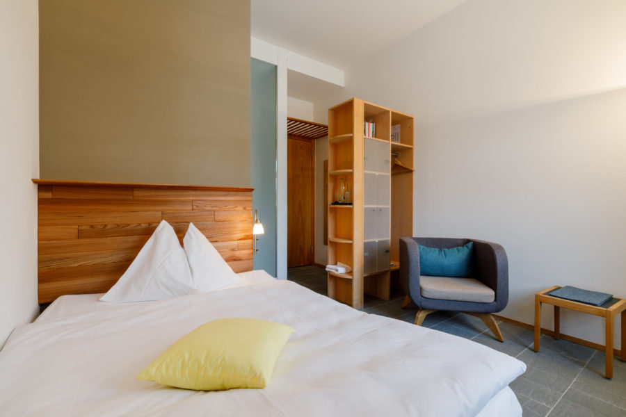 This “mini-suite” has a double room with a Huesler bed (natural bed from Hüsler) and a separate room with a bunk bed. Ideal for families.