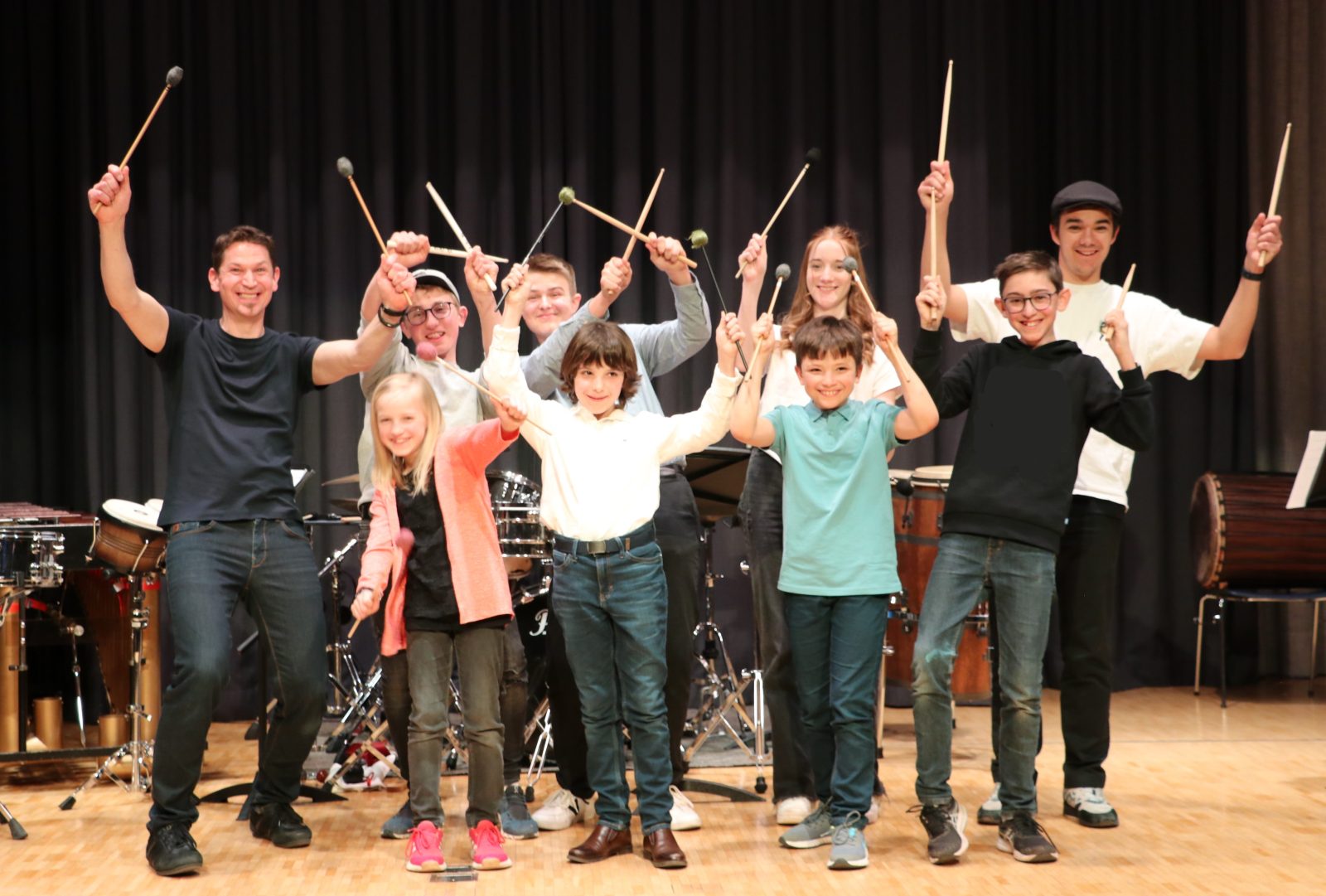 Die Jugendlichen im Alter von 10-19 Jahren spielen auf einer grossen Auswahl von Schlaginstrumenten wie Drumset, Trommeln, Marimbaphon, Vibraphon, Xylophon, Glockenspiel, Becken, Triangel, Cowbell, Tamburin und vielen weiteren – auch ungewöhnlichen – Klangerzeugern.